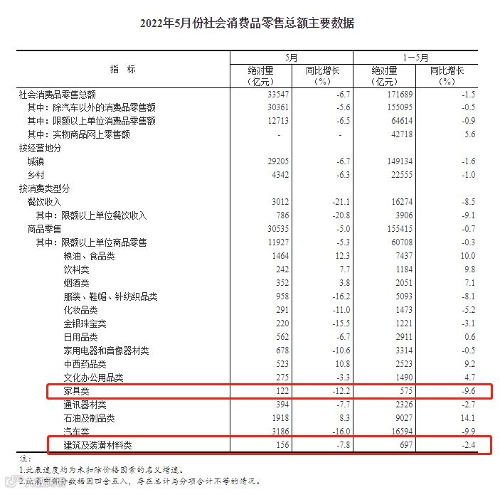 近日国家统计局发布了《2022年1-5月份社会消费品零售总额下降1.5%》。其中家具类五月份社会消费品零售总额绝对值122亿元,同比下滑12.2%;建筑及装潢材料零售总额绝对值156亿元,同比下滑7.8%。1-5月份整体家具类销售总额575亿元,同比下滑9.6%;建筑及装潢材料1-5月份总销售额697亿元,同比下滑2.4%。