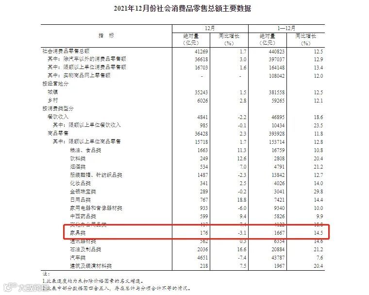 其中,家具类的消费品零售额1667亿元,同比增长14.5%。其中,2021年12月份,社会消费品零售总额41269亿元,同比增长1.7%。其中,家具类的消费品零售额176亿元,同比下降3.1%。