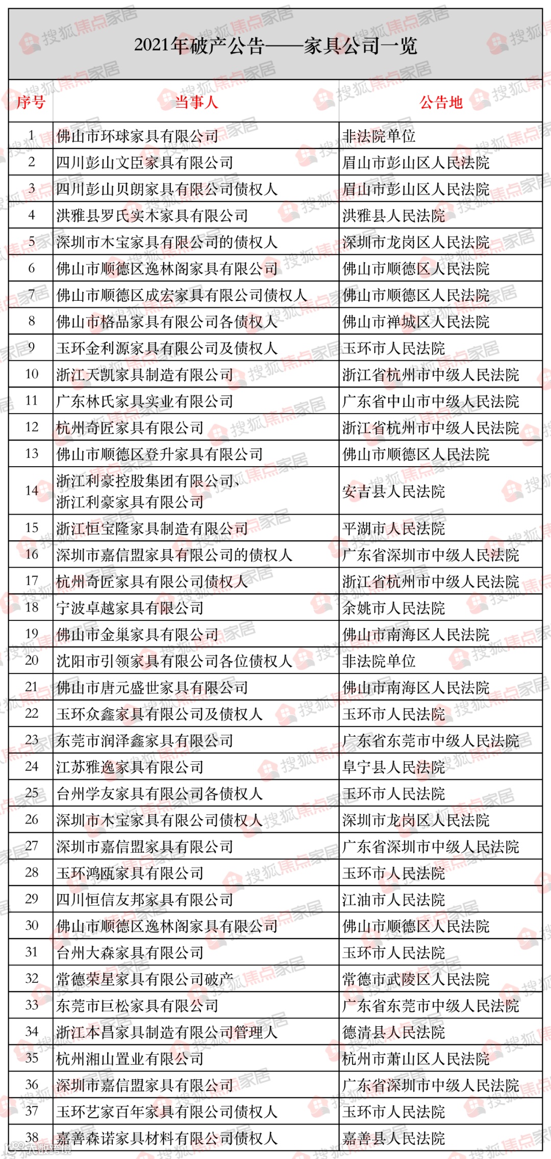 据人民法院公告网公开信息,搜狐焦点家居整理发现,2021年,有38家具备一定实力的家具企业破产,涉及木质家具、软体家具、床上用品、竹木制品等领域,比如利豪沙发、西奥多家居、贝朗家具、环球家具、金巢家具、卓越家具、海阔家具等。