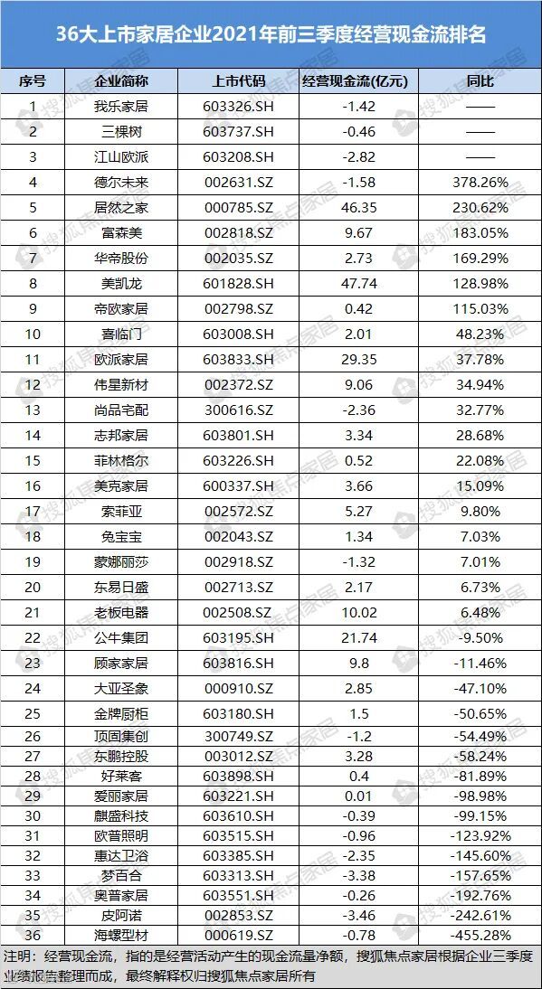 36大上市家居企业现金流: