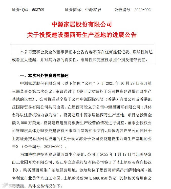 2022年1月18日,中源家居(603709.SH)公告,为加快推进投资建设墨西哥生产基地,公司于2022年1月17日与北美华富山工业园开发有限公司、浙江华立富通投资有限公司签订了《土地购买意向协议书》,购买墨西哥生产基地经营用地,该地块位于墨西哥新莱昂州萨利纳斯·维多利亚市北美华富山工业园,土地款总价为468.99万美元,其他相关费用由公司承担。