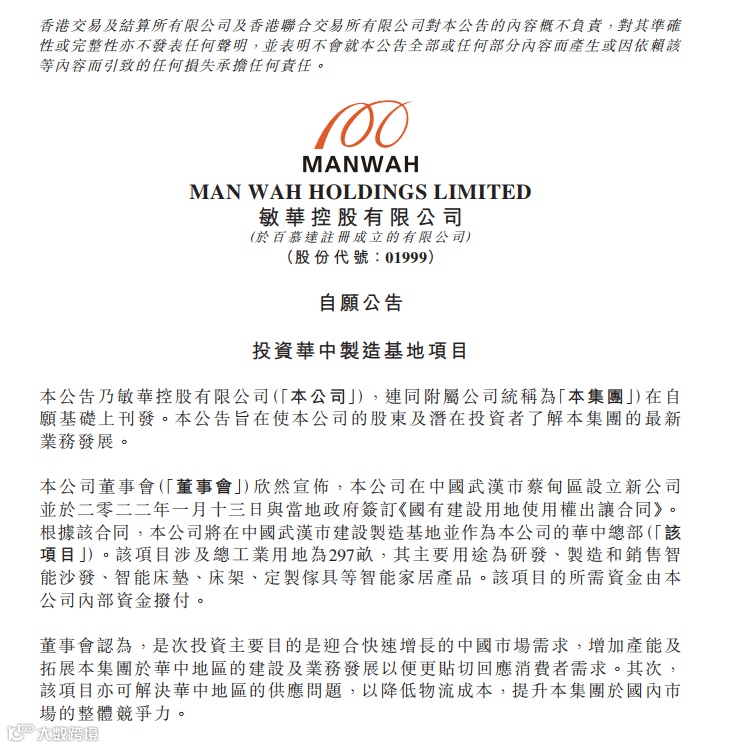 2022年1月13日晚间,敏华控股公告,公司将在中国武汉市建设制造基地并作为公司的华中总部。据了解,该项目涉及总工业用地为297亩,其主要用途为研发、制造和销售智能沙发、智能床垫、床架、定制傢具等智能家居产品。该项目的所需资金由公司內部资金拨付。