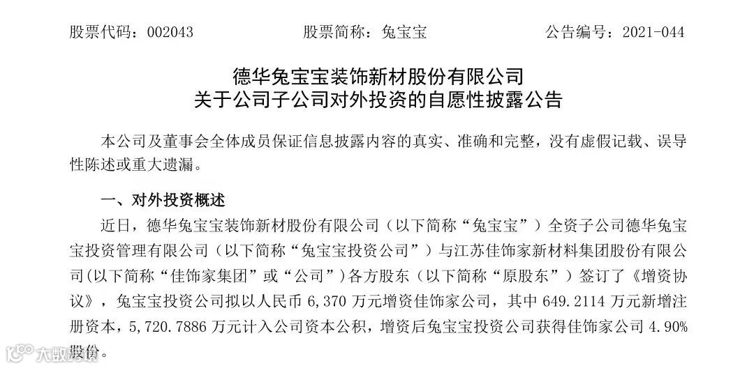 9月17日,兔宝宝(002043.SZ)发布公告,其全资子公司德华兔宝宝投资管理有限公司(以下简称“兔宝宝投资公司”)与江苏佳饰家新材料集团股份有限公司(以下简称“佳饰家集团”)各方股东近日签订了《增资协议》。
