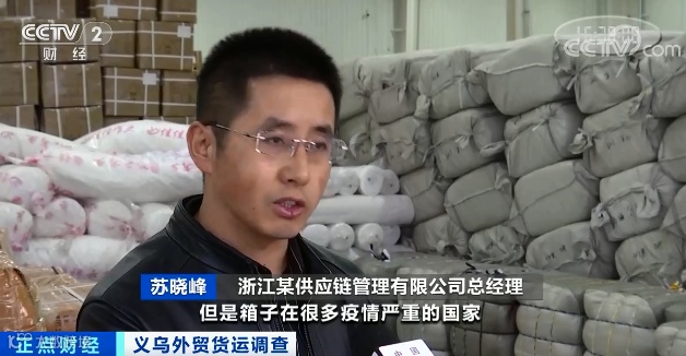 浙江某供应链管理有限公司总经理 苏晓峰:我们的舱位下不来,或者是码头没有集装箱,我们货源很充足,但是箱子在很多疫情严重的国家回不来,导致堆场的箱子很少。