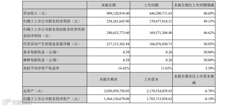 8月9日,浙江美大(002677.SZ)发布2021年半年度报告,公司实现营业总收入9.09亿元,较上年同期增长40.69%,实现归属于上市公司股东的净利润2.54亿元,较上年同期增长49.15%。