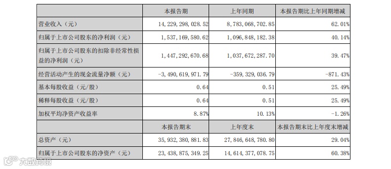 8月9日,东方雨虹(002271.SZ)发布2021年半年度报告,公司实现营业总收入142.29亿元,较上年同期增长62.01%,实现归属于上市公司股东的净利润15.37亿元,较上年同期增长40.14%。