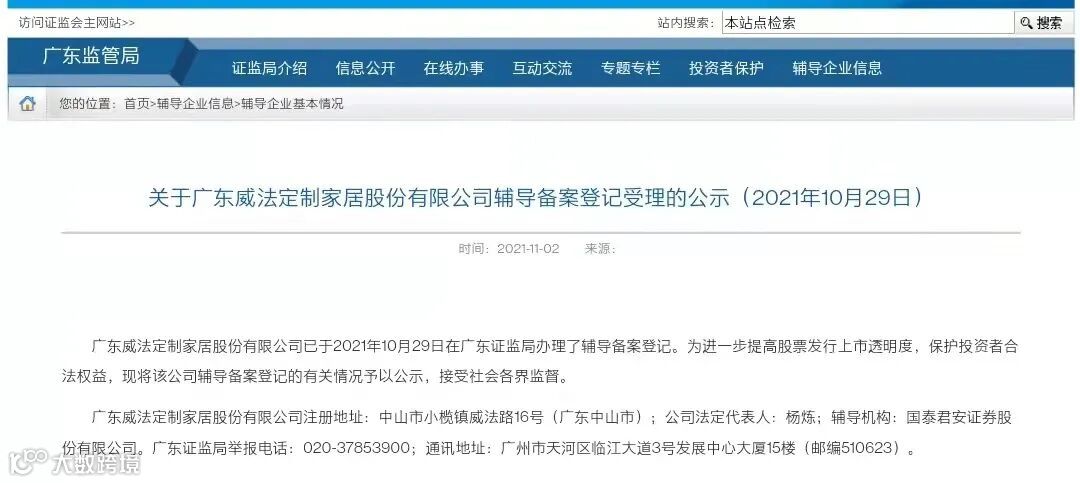据广东证监局公告,广东威法定制家居股份有限公司已于2021年10月29日在广东证监局办理了辅导备案登记,辅导机构为国泰君安证券股份有限公司。
