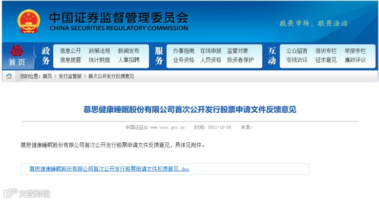 2021年6月22日,慕思健康睡眠股份有限公司预披露招股说明书发布,拟在深市主板上市。2021年10月29日,证监会官网披露了慕思健康睡眠股份有限公司的首发反馈意见。