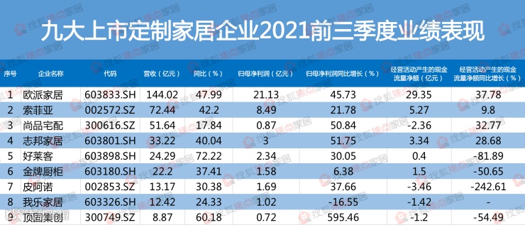 九大上市定制家居企业前三季度:1家净利下滑、4家现金流为负