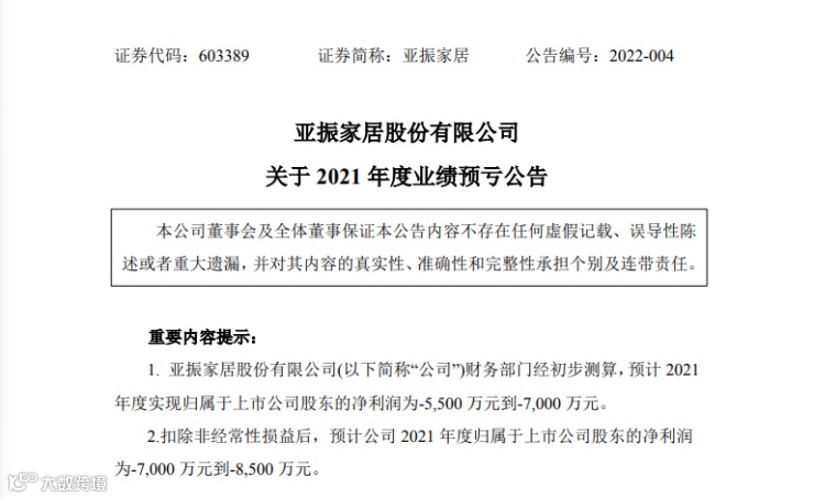 亚振家居2022-01-26发布业绩预告,预计2021年全年归属净利润亏损5500.00万元至7000.00万元,同比上年下降429.09%至518.85%。