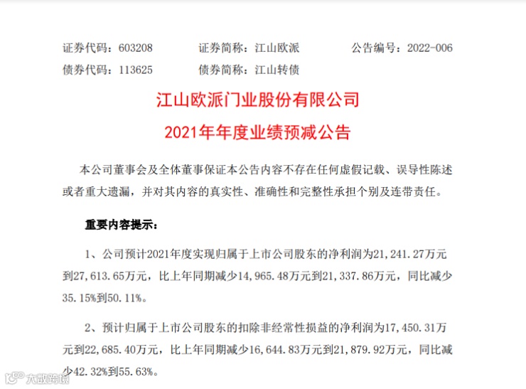江山欧派:2021年度净利预减35.15%-50.11%
