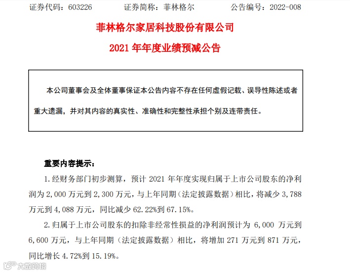 菲林格尔:2021年度净利预减62.22%-67.15%