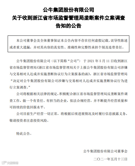 5月12日晚间,公牛集团发布公告称,公司于5月11日收到浙江省市场监督管理局《浙江省市场监督管理局关于上报公牛集团股份有限公司涉嫌与交易相对人达成并实施垄断协议行为立案报备的函》,浙江省市场监督管理局“决定对公牛集团股份有限公司涉嫌与交易相对人达成并实施垄断协议行为进行立案调查”。
