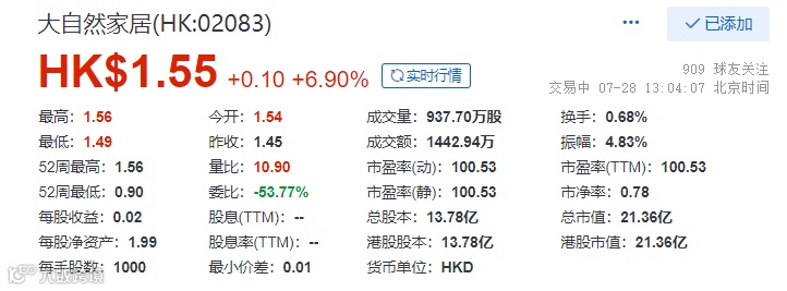 2021年7月28日,大自然家居复牌,截至13时04分,股价高涨近7%,总市值21.36亿元。