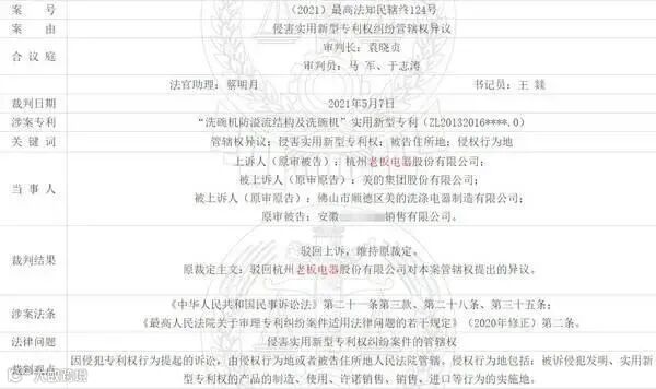 而老板电器在提交答辩状期间对案件管辖权提出异议,老板电器认为因侵犯专利权行为提起的诉讼,由侵权行为地或者被告住所地人民法院管辖,应当认定浙江省杭州市为侵权行为地。老板电器认为原审法院对本案不具有管辖权,因此上诉至中华人民共和国最高人民法院,请求将本案移送至浙江省杭州市中级人民法院审理。但该上诉遭到最高法驳回并维持原裁定。