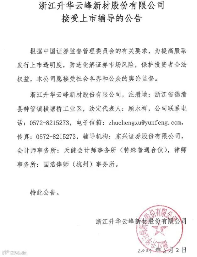 2月18日消息,浙江升华云峰新材股份有限公司(以下简称“升华云峰”)拟首次公开发行股票并上市,并已向浙江监管局提交了上市辅导资料,辅导机构为东兴证券股份有限公司。