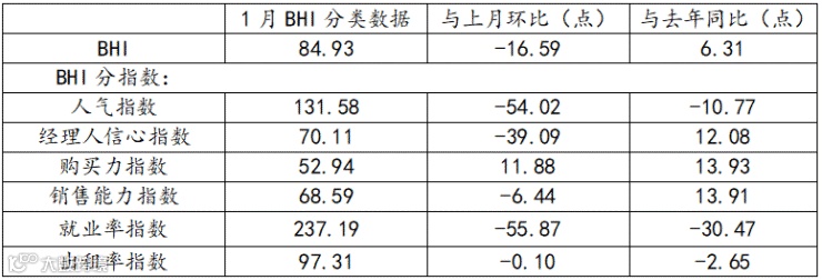 由商务部流通业发展司、中国建筑材料流通协会共同发布的全国建材家居景气指数BHI 1月份全国建材家居景气指数(BHI)为84.93,环比下降16.59点,同比上涨6.31点。全国规模以上建材家居卖场1月销售额为755.5亿元,环比下降8.59%,同比上涨25.45%。