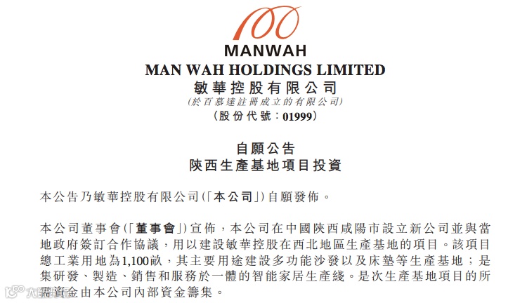 公司在中国陕西咸阳市设立新公司并与当地政府签订合作协议,用以建设敏华控股在西北地区生产基地的项目。