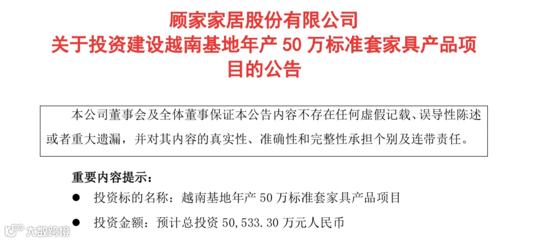 11月25日,顾家家居发布公告,公告内容显示,顾家家居拟使用自筹资金5.05亿元投资建设越南基地家具产品项目。