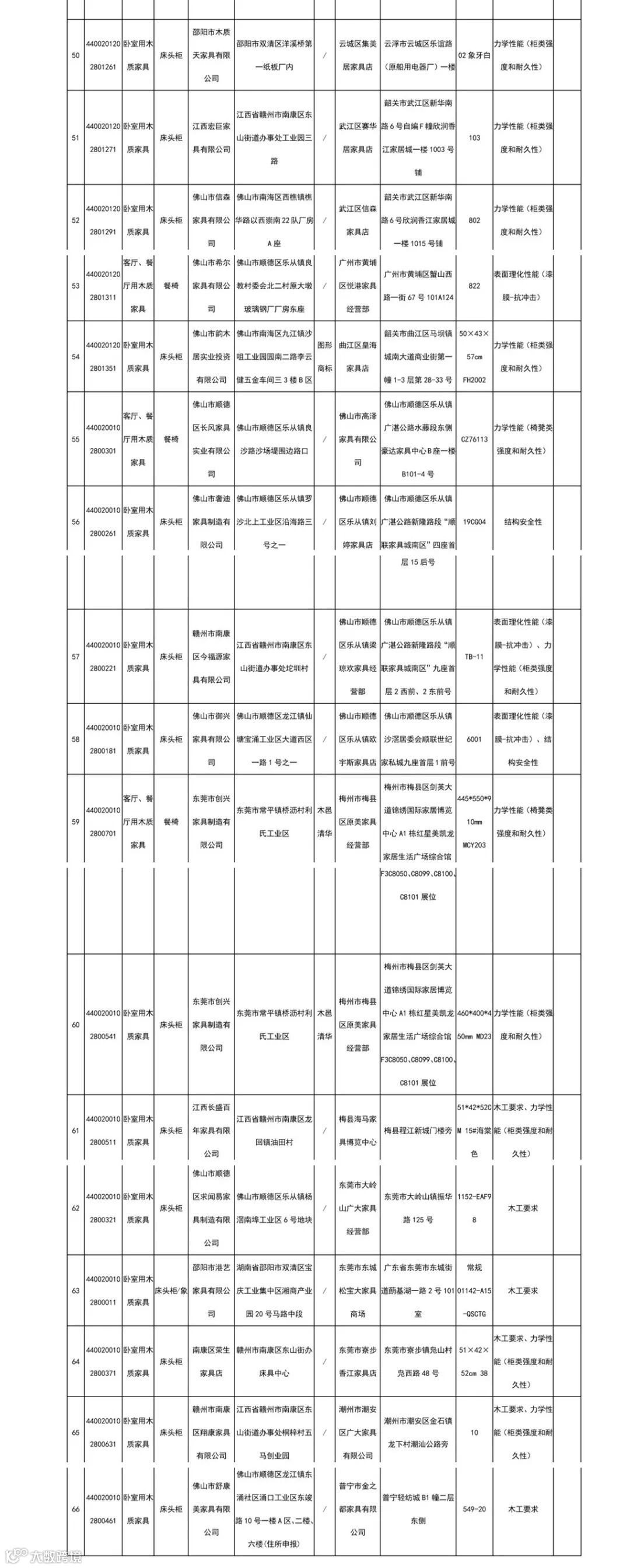 经检验,发现59家企业生产的66款产品不合格,涉及床头柜、餐椅、圆凳等多种产品。不合格项目主要有:“木工要求”“结构安全性”“表面理化性能(漆膜-抗冲击)”“力学性能(柜类强度和耐久性)”“表面理化性能(漆膜-耐液性)”“力学性能(椅凳类强度和耐久性)”“有害物质限量(甲醛释放量)”“结构安全(边缘及尖端)”“柜类强度(推拉件强度试验)”等。