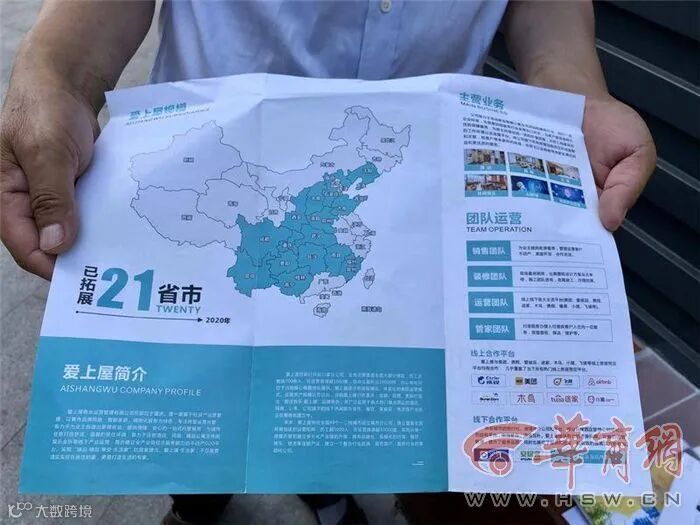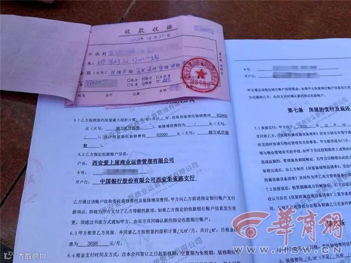 记者看到合同上写着,乙方为西安爱上屋商业运营管理有限公司,公司地址在碑林区陕西建工安装集团有限公司,合同约定租金为3698元,装修费用为82000元,合同期4年。爱上屋的宣传册上显示,爱上屋总部在重庆,全国21个省市有分公司,主营业务为公寓民宿。