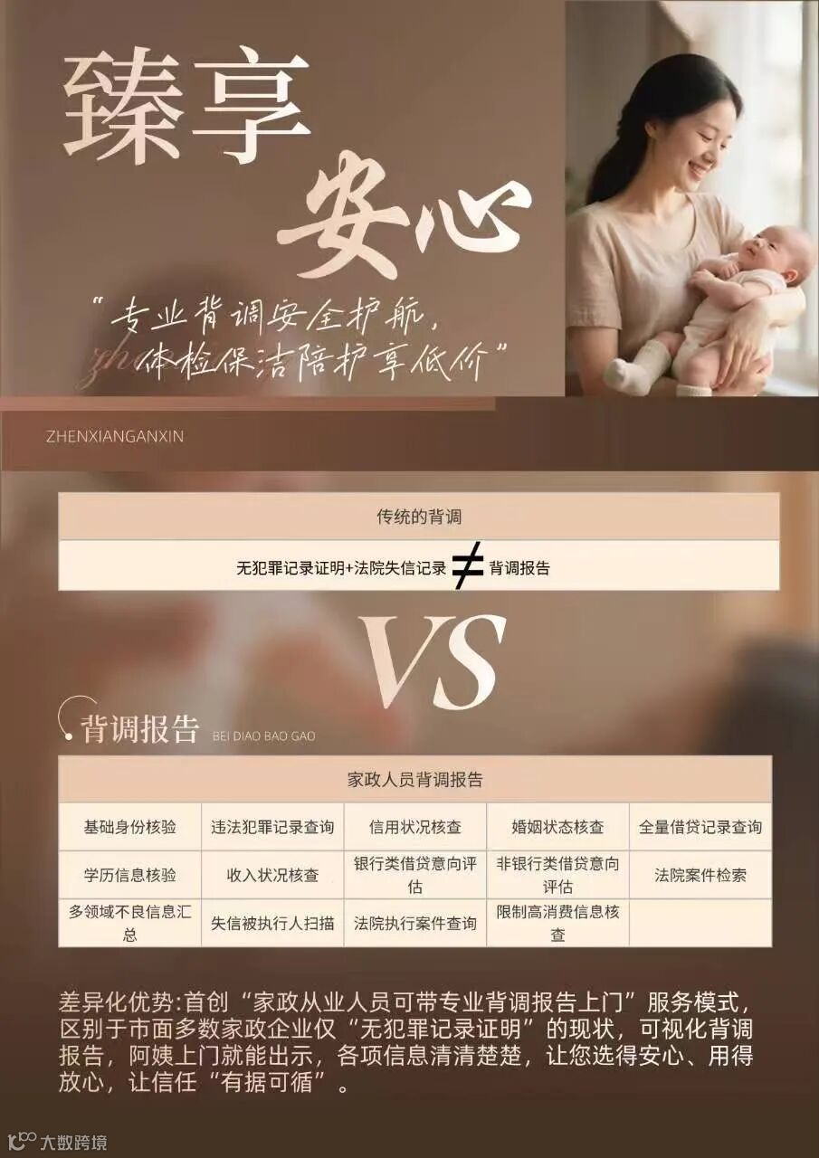 •差异化优势:首创“家政从业人员可带专业背调报告上门”服务模式,区别于市面多数家政企业仅“无犯罪证明”的现状,以可视化背调报告直面客户,大幅提升服务信任度与竞争力