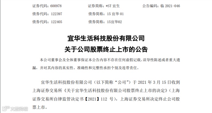 3月15日晚间,*ST宜生(600978.SH)发布公告,根据《上海证券交易所股票上市规则(2020年修订)》规定,上海证券交易所在公告本决定之日后的5个交易日内,对公司股票予以摘牌,公司股票终止上市。