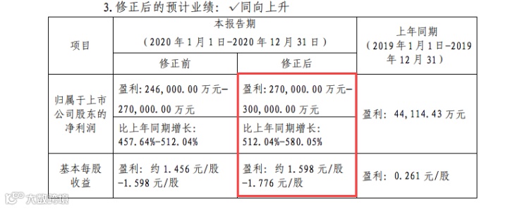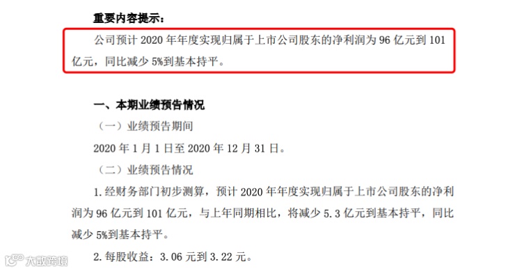 经财务部门初步测算,预计2020年年度实现归属于上市公司股东的净利润为96亿元到101亿元,与上年同期相比,将减少5.3亿元到基本持平,同比减少5%到基本持平。每股收益3.06元到3.22元。