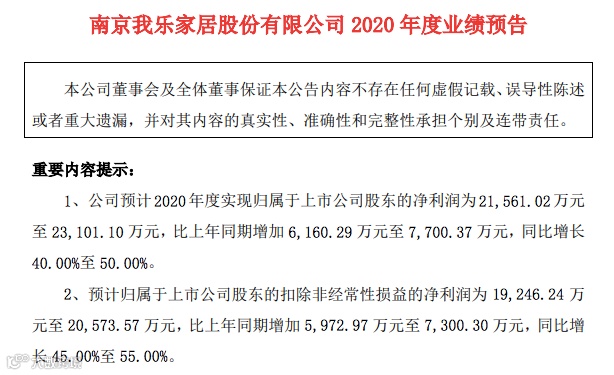 1月15日,我乐家居(603326.SH)披露2020年度业绩预告,预计2020年度实现归属于上市公司股东的净利润为2.16亿元至2.31亿元,同比增长40%至50%;预计归属于上市公司股东的扣除非经常性损益的净利润为1.92亿元至2.06亿元,同比增长45%至55%。