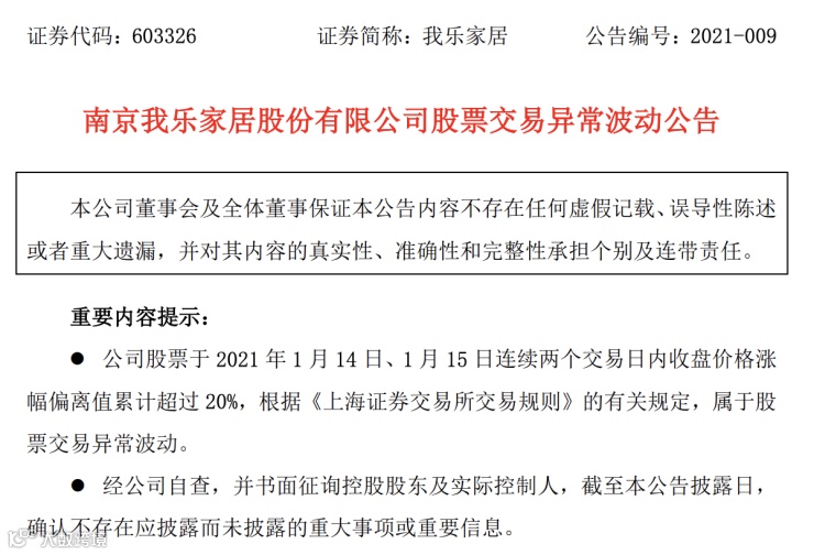 近日,我乐家居发布公告称,公司股票于 2021 年 1 月 14 日、1月 15 日连续两个交易日内收盘价格涨幅偏离值累计超过 20%,根据《上海证券交易所交易规则》的有关规定,属于股票交易异常波动。