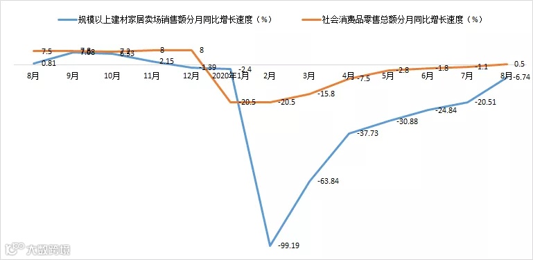 首先,与社会消费品零售总额进行对比分析:8月份,社会消费品零售总额33571亿元,同比增长0.5%,为今年以来首次正增长。其中,除汽车以外的消费品零售额30158亿元,下降0.6%。全国规模以上建材家居卖场8月销售额为752.86亿元,环比上涨16.11%,同比下降6.74%;占社会消费品零售总额比率为2.24%,占除汽车以外的消费品零售额比率为2.50%。