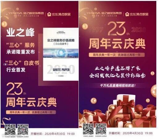 4月30日,业之峰装饰“23周年云庆典”盛大开启,“三心”服务承诺暨“三心”白皮书同期发布。继4.11日“亿起腾飞” 云发布会之后,“新晋网红“业之峰董事长张钧再度携手分众传媒董事长江南春、著名主持人王小骞相约云庆典。