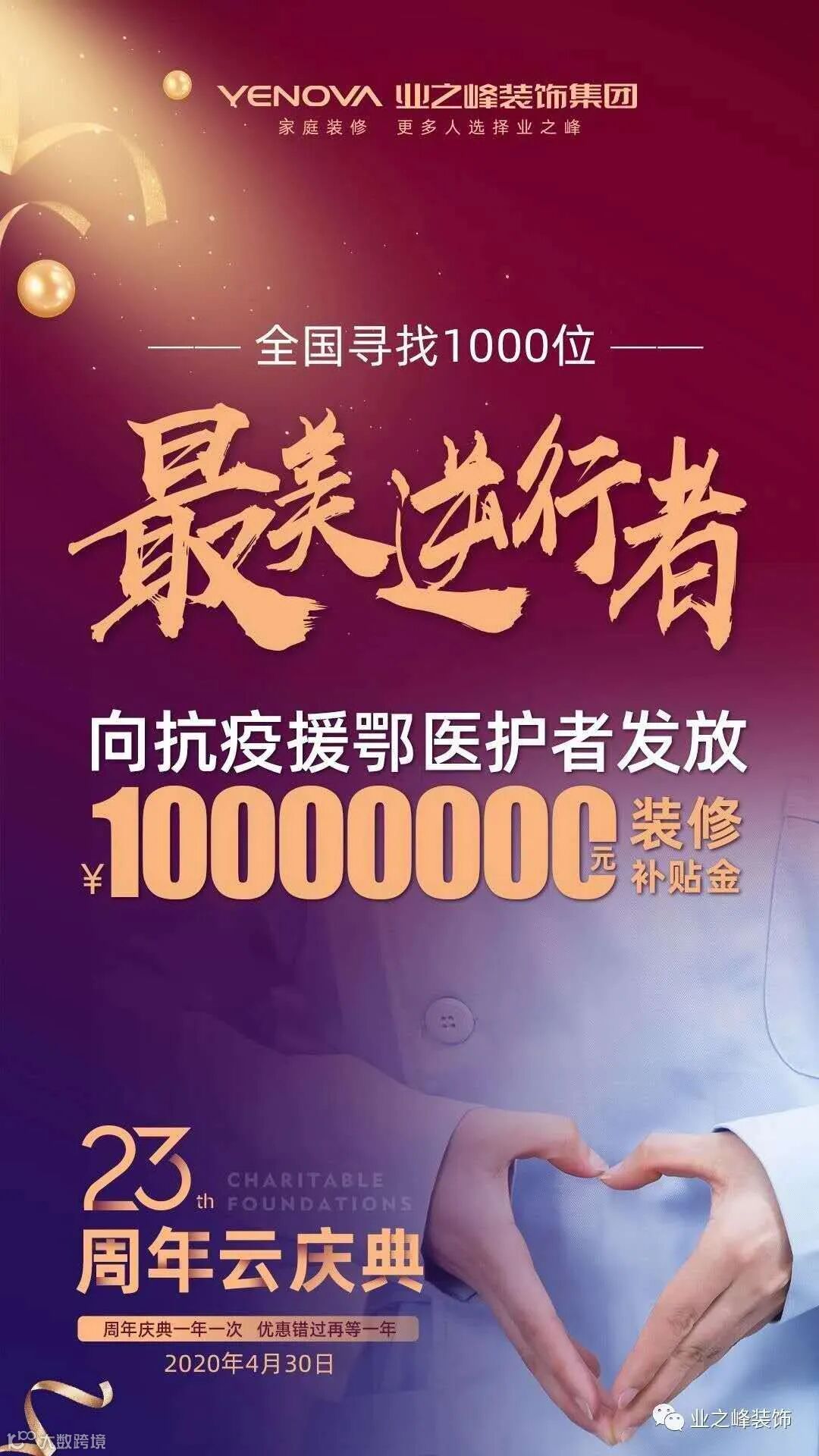 此外,业之峰为期一年的“全国寻找1000位最美逆行者”活动正式开启,面向全国23家直营店、50多家特许经营店铺,入选的“逆行者”可无条件地获得业之峰提供的一万元装修补贴。大爱之举传承了业之峰的爱心和公益心,“业之峰在公益道路上永无止境“张钧说道。业之峰的逆行之路远不如此,搜狐焦点家居了解到,业之峰目前正在筹备云展会,届时将携众多供应商、材料商通过线上为消费者带来“严选”的家居、家装产品。
