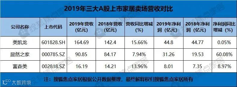 近期公布的2019年年报数据显示,红星美凯龙、居然之家、富森美三家家居卖场在2019年均实现了营收和净利润的增长。红星美凯龙营收高达164.69亿元,同比增长15.66%,总额远超居然之家和富森美的营收总和,居然之家营收90.85亿元,同比增长7.94%,富森美营收16.19亿元,同比增长13.96%。净利润方面,居然之家净利润19.53亿元,虽低于红星美凯龙,但同比增长高达60.08%。富森美整体表现虽良好,营收与净利润两项数据增幅均超过8%。但这家上市第四年的企业净利润增长率从22.82%、17.13%、12.89%一路下跌至去年的8.97%,业绩增速逐渐趋缓。