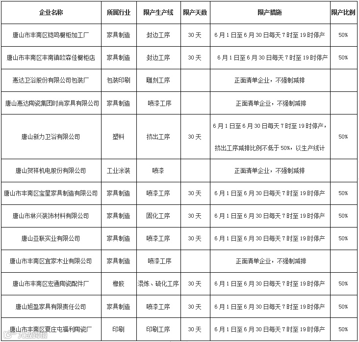 6月3日,唐山丰南区官网发布6月份空气质量强化管控期间停限产调度安排表,涉及建材、卫浴、陶瓷、家具制造、钢铁、冶金、焦化、塑料、化工等行业的企业230家。其中,唐山新力卫浴有限公司的挤出工序从6月1日至6月30日每天7时至19时被要求停产,限制时间达30天,限产比例为50%。(来源:厨卫资讯)