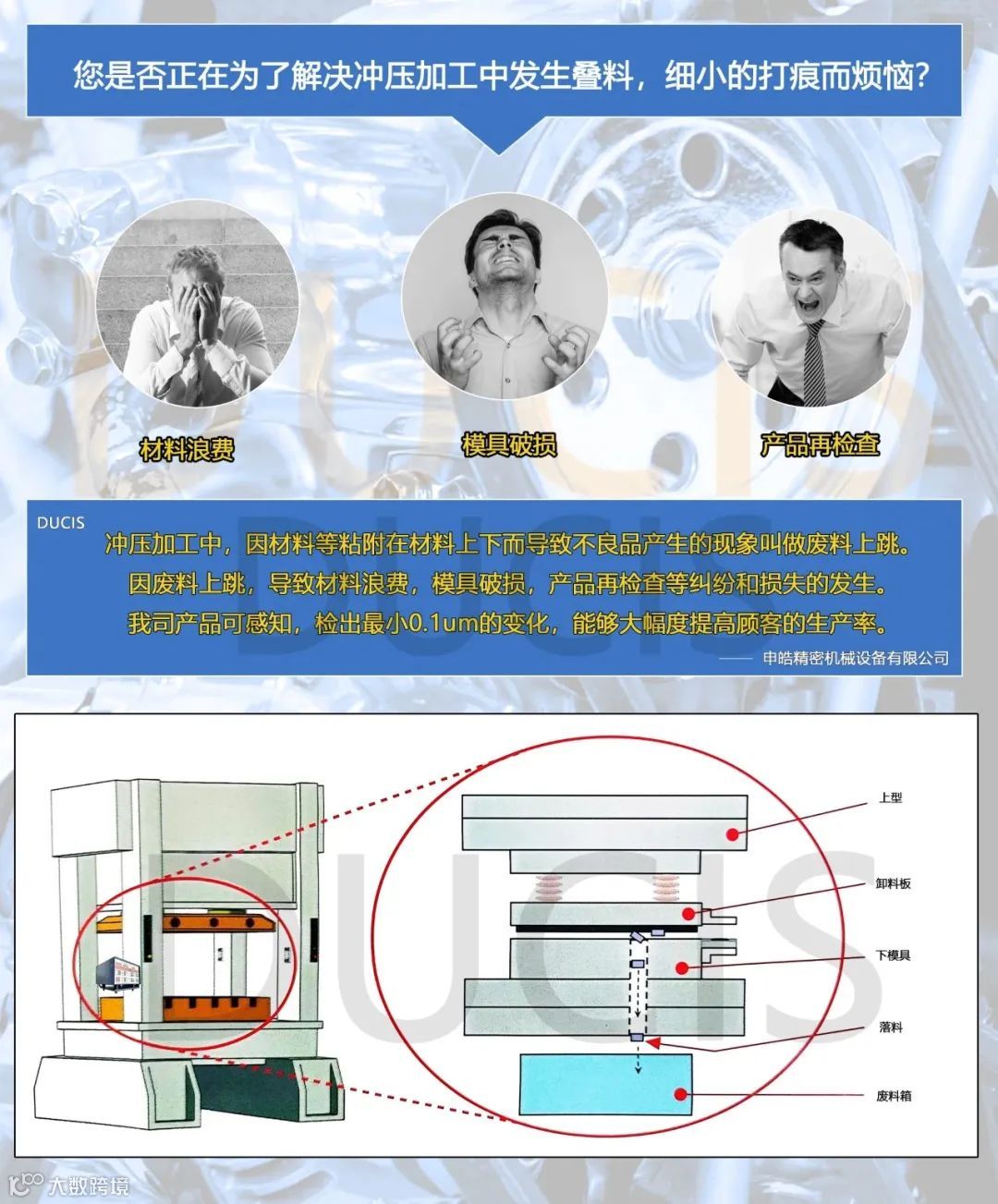 针对高速自动冲压过程中产品压伤,材料厚度异常、冲件重叠、模具内有废料等难以目视检测,由该检知器自动检测,并适时停机保护机械及模具,防止模具被打坏,有效提高产品质量及冲件品质。