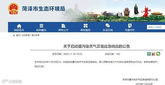 11月30日,山东省菏泽市生态环境厅发布关于启动重污染天气Ⅱ级应急响应的公告,公告显示菏泽市自2020年11月30日12:00起启动重污染天气Ⅱ级应急响应。