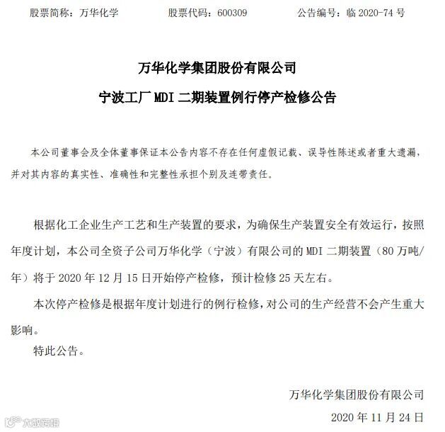 11月24日,万华化学公告披露,根据化工企业生产工艺和生产装置的要求,为确保生产装置安全有效运行,按照年度计划,本公司全资子公司万华化学(宁波)有限公司的MDI二期装置(80万吨/年)将于2020年12月15日开始停产检修,预计检修25天左右。