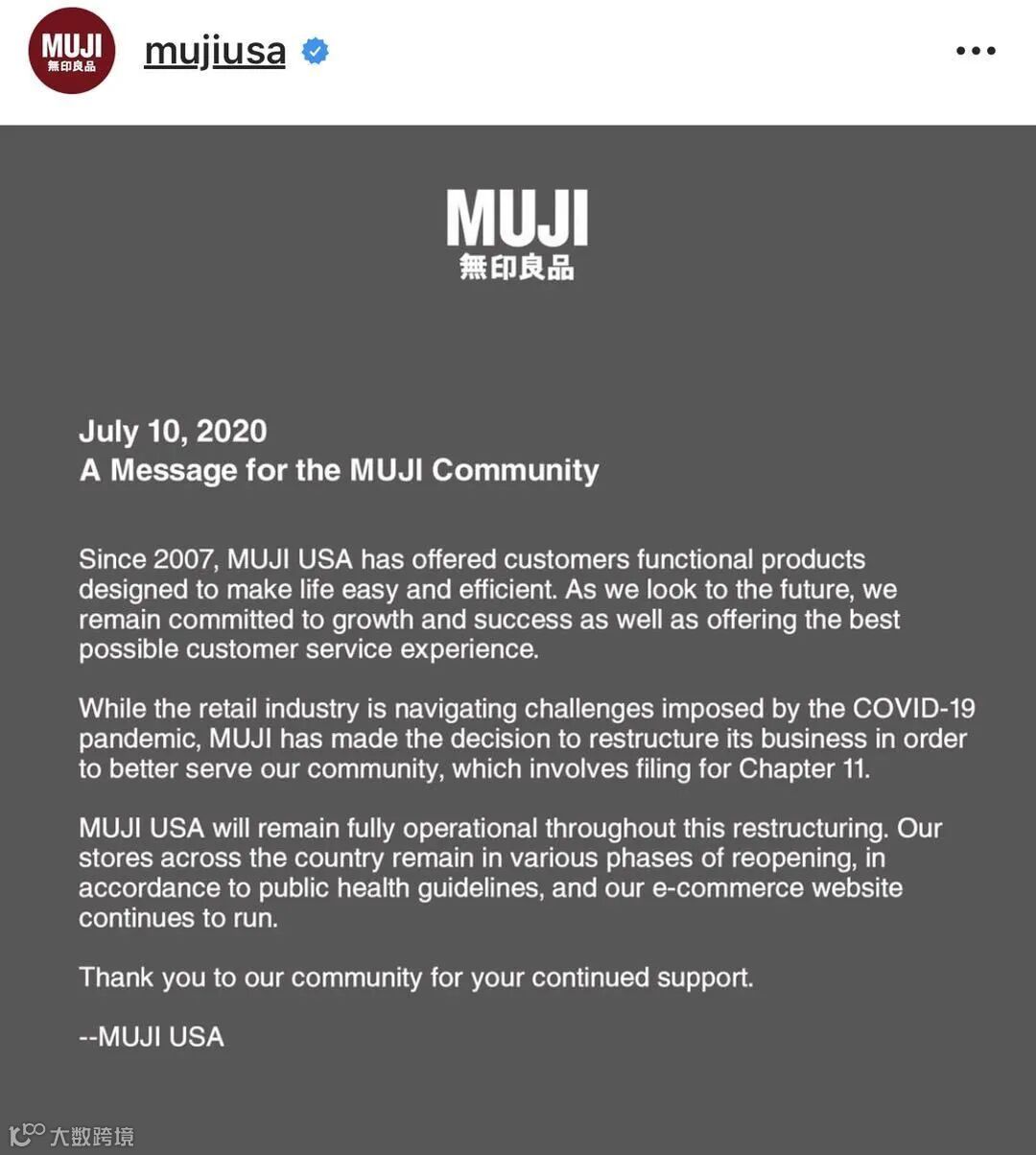 MUJI美国子公司发布破产重组声明