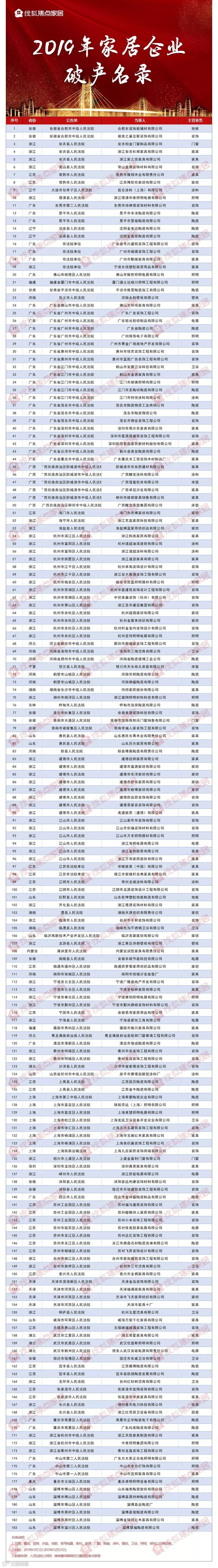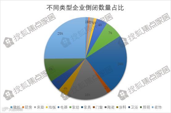 从统计数据看,破产一览表中装饰公司成为破产比例最高的家居行业,2019年倒闭数量占比四分之一,共有46家企业遗憾离场;家具制造企业倒闭数量紧随其后,2019年共43家企业宣告破产,占比超过两成;陶瓷企业以30家位列破产第三名。此外,照明、家纺、电器、卫浴、壁纸等均有企业宣告离场。