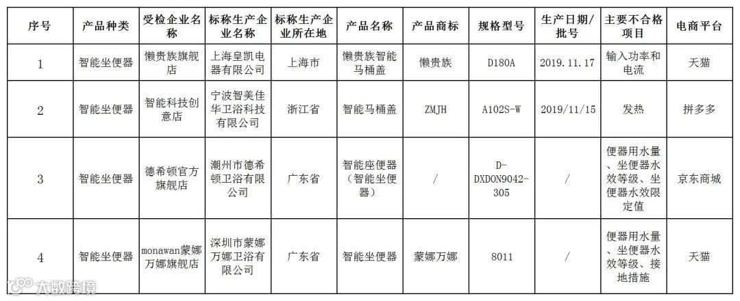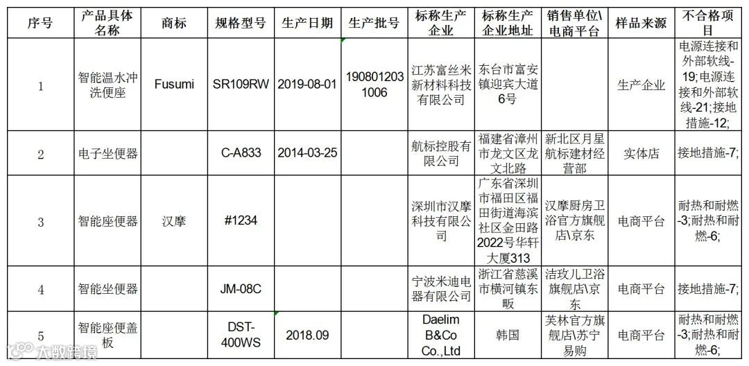 1月21日,江苏省市场监督管理局网站通报2019年省级第4批消费品和第3批工业品质量监督抽查情况。其中,共抽查智能马桶盖产品49批次,其中5批次产品不合格,不合格发现率10.2%。抽查不合格项目为电源连接和外部软线、接地措施、耐热和耐燃3项指标,有2批次产品的电源连接和外部软线、3批次产品的接地措施、4批次产品的耐热和耐燃项目不合格。