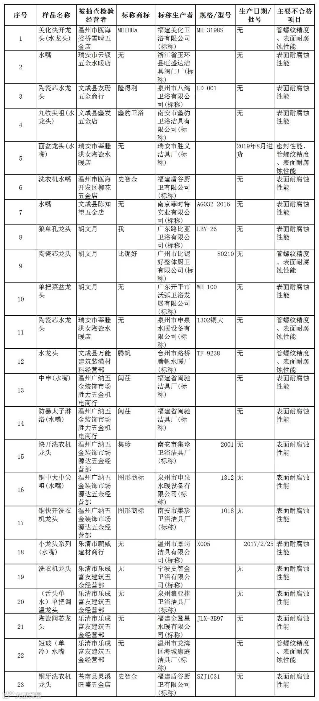 1月20日,温州市市场监督管理局通报2019年度流通领域家装建材产品质量抽查检验结果。本次共抽检33批次水嘴产品,经经验,发现23批次不合格,不合格项目涉及管螺纹精度、表面耐腐蚀性能、密封性能等。