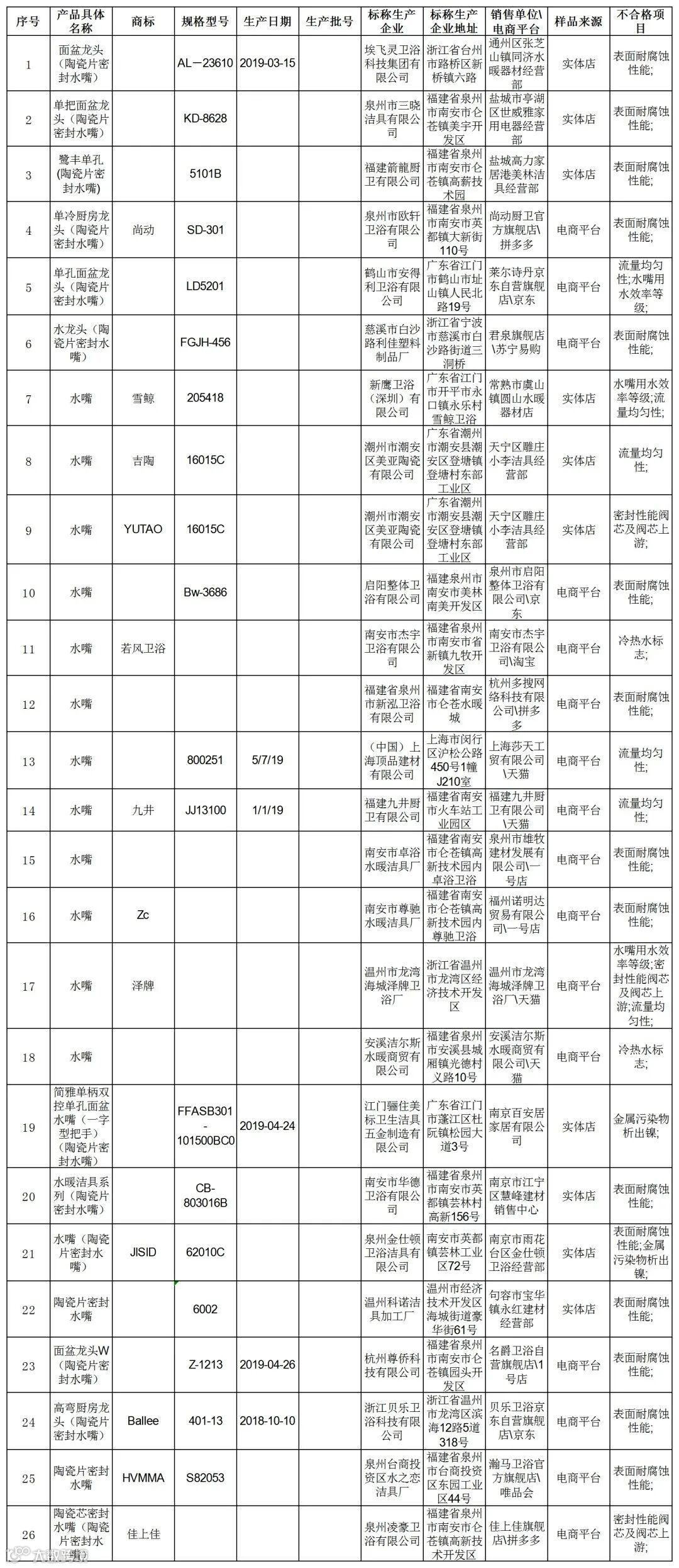 在江苏省市场监督管理局2019年省级第4批消费品和第3批工业品质量监督抽查中,共抽查了水嘴产品100批次,其中不合格产品26批次,不合格产品发现率为26%,不合格项目涉及表面耐腐蚀性能、金属污染物析出镍、冷热水标志、流量均匀性、密封性能阀芯及阀芯上游、水嘴用水效率等级6项指标。