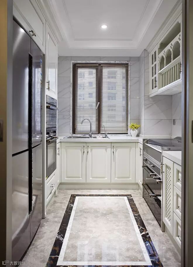 ▲厨房以白色为主调,金属色的现代厨具配上新古典风格的橱柜设计,还有房中无处不在的黄色花卉做装饰。