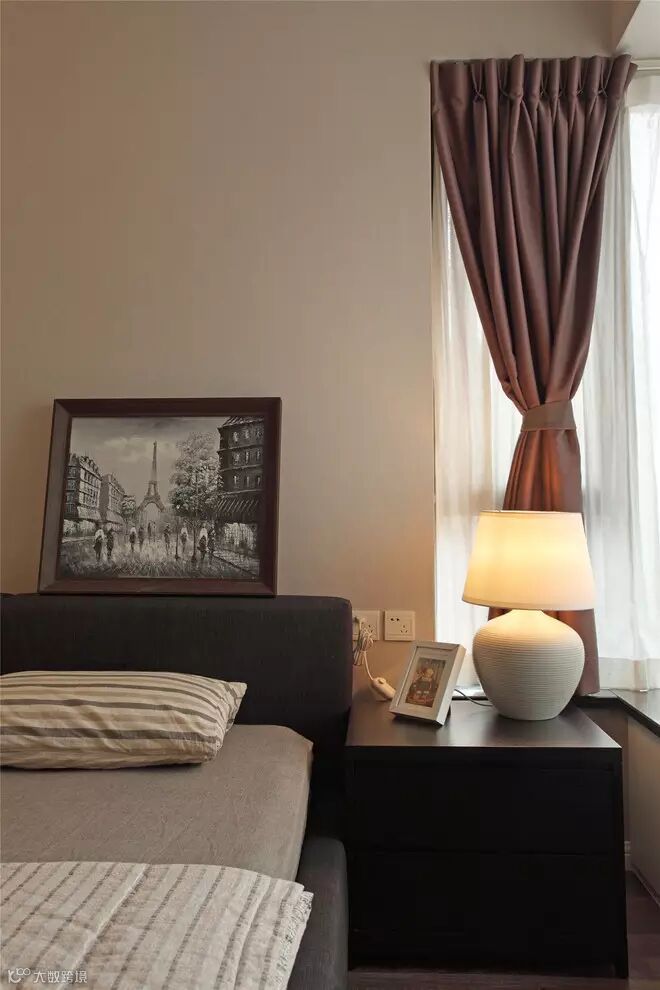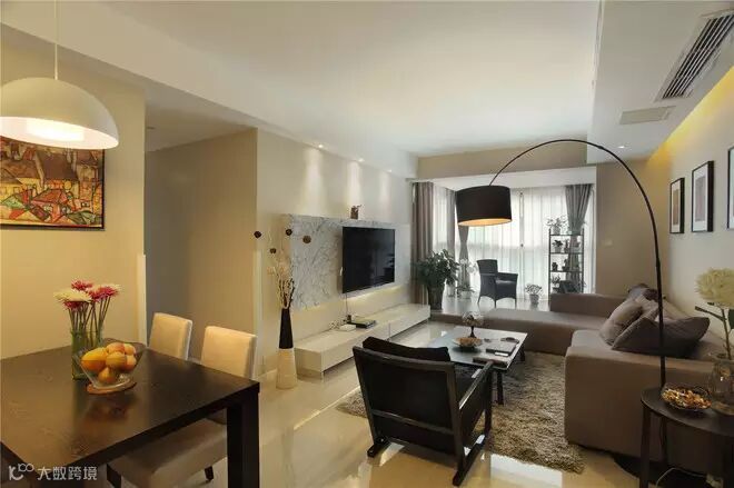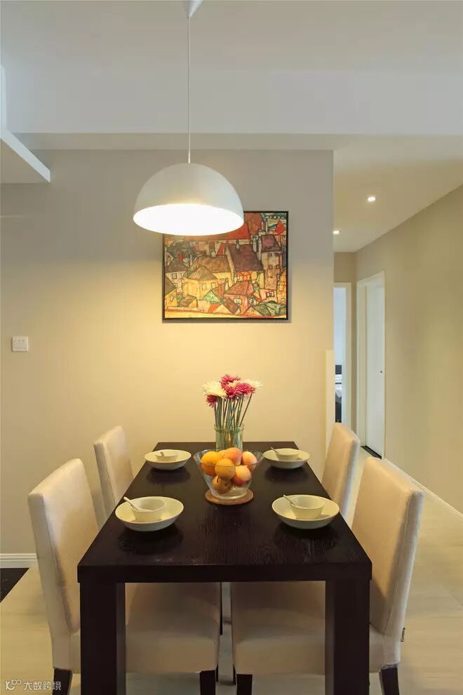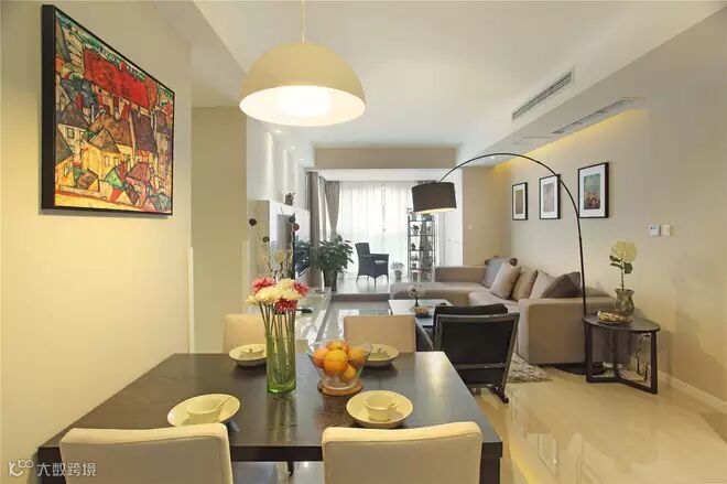 1, 客厅是主人品位的象征,在沙发背景墙没有过多的修饰,墙面是暖色的乳胶漆加上简洁的装饰画。