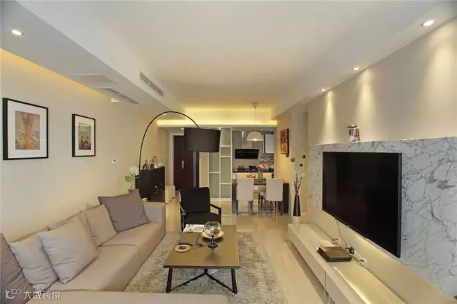 4, 在空间的结构设计上完美的结合了灯光,电视墙采用的是爵士白大理石来提升整个空间的质感。