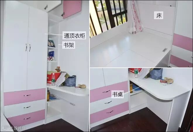 房间的整体基调,选用小女生喜爱的粉红色+白色,十分温馨。衣柜、书架、书桌一体式设计。