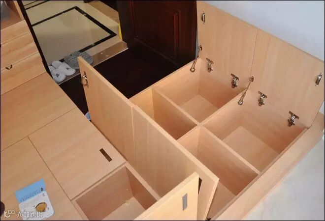 榻榻米的高度与飘窗平齐,让整个榻榻米平面活动空间更加宽敞。多个间隔收纳柜,可分别收纳多种家庭杂物。小狐细心地发现,使用板材的内部与外部纹理统一。