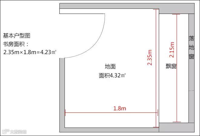 书房有一个飘窗,除去飘窗的面积不算,房间面积为4.32㎡。长、宽如下图显示。无论怎么摆放家具,尺寸都略显尴尬。