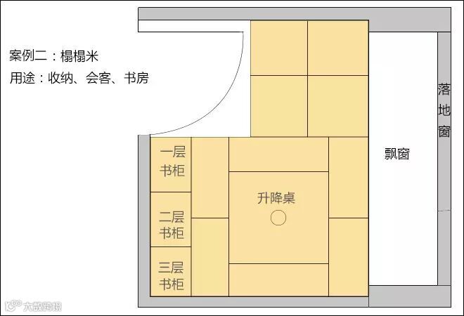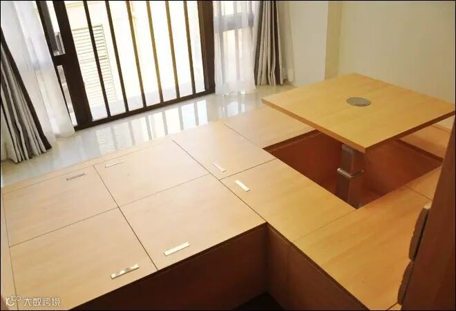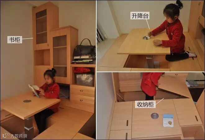 升降台,小女孩都可以操作,十分便捷。在榻榻米的后方设置了书柜,可以摆放书籍以及收纳各种杂物。